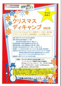 今年も洞川教育キャンプ場でクリスマスディキャンプを 実施します。昨年同様チキン料理やケーキ作り、焼き板 でツリークラフト作り、自然体験ゲームを実施します。 お友達を誘って楽しいクリスマスを過ごしてみませんか?