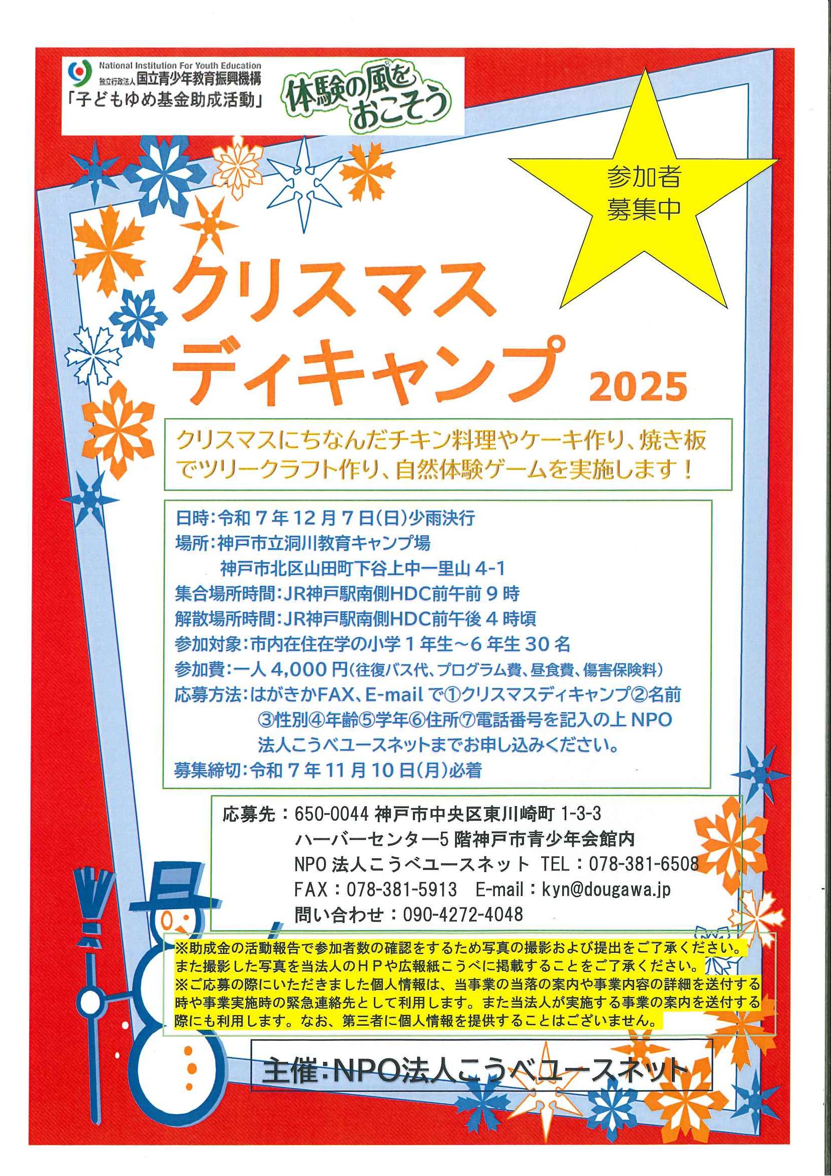 クリスマスディキャンプ2025参加者募集中! 2025年10月7日 最終更新日時 : 2025年10月7日 dougawakanri 今年も洞川教育キャンプ場でクリスマスディキャンプを 実施します。昨年同様チキン料理やケーキ作り、焼き板 でツリークラフト作り、自然体験ゲームを実施します。 お友達を誘って楽しいクリスマスを過ごしてみませんか? FacebookXBluesky