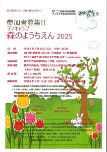 ディキャンプ森のようちえん2025 参加者募集中! 2026年2月3日 最終更新日時 : 2026年2月3日 dougawakanri 今年も3月8日(日)に「ディキャンプ森のようちえん2025」を 実施いたします。火おこしから飯盒炊さん、自然体験活動や クラフトなどプログラムが満載です。この機会にお友達を お誘いのうえご応募をお待ちしています。 FacebookXBluesky
