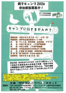 親子キャンプ2026 参加家族募集中! 2026年3月21日 最終更新日時 : 2026年3月21日 dougawakanri 本年度も、5月2日(土)~3日(日)に親子キャンプを実施します。 家族ごとにテント泊、野外料理、クラフト、自然体験ゲームなど 親子で楽しく過ごせるキャンプです。ぜひこの機会に自然体験キャンプに 参加してみませんか?ご応募お待ちしています。 FacebookXBluesky